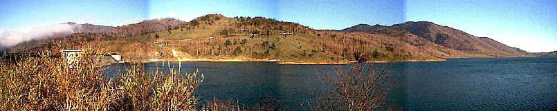 野反湖をダム横より撮影しました。画像をつなげてパノラマにして見ましたが、重なり部分の色がもう一つあわずうまく重ならなったようです。