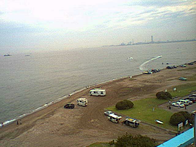 東電の富津発電所を望むことができる。海岸では釣りや水上モービルで興じている人々を見ることができる。