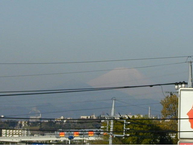 少し霞んでいますが、まだ雪に覆われた富士が見えます。
