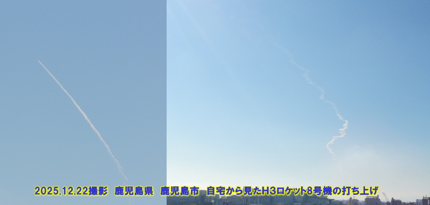 鹿児島県 鹿児島市 自宅から見たH3ロケット8号機の打ち上げ H3ロケット8号機は2回の延期の後、2025年(令和7年)12月22日10時51分30秒(日本標準時、24時間表記)に、種子島宇宙センターから準天頂衛星システム「みちびき5号機」の打上げを行いましたが、第2段エンジン第2回燃焼が正常に立ち上がらず早期に停止したことから、予定した軌道に「みちびき5号機」を投入することができず、残念ながら打上げに失敗しました。2段目のロケットと「みちびき5号機」は数時間後に大気圏に再突入して落下したようです。