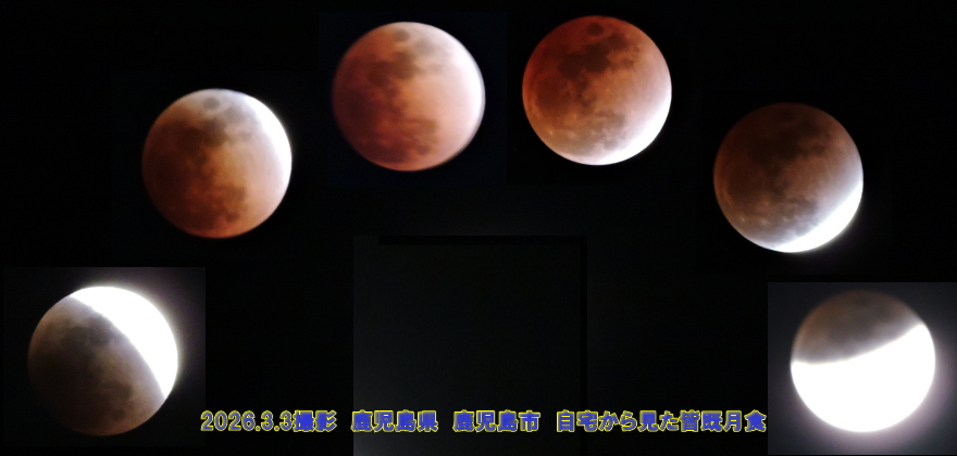 鹿児島県 鹿児島市 自宅から見た皆既月食 月は、東の空で18時50分頃に欠け始め、20時04分頃に皆既食となりました。皆既食となった月は、「赤銅色(しゃくどういろ)」と呼ばれる、赤黒い色に見えるとのことでしたが、肉眼ではあまり良く見えませんでした。しかし、カメラで撮影すると赤黒い色がよく見えていました。皆既食は21時03分頃に終わり、その後は徐々に欠けた部分が小さくなっていき、22時18分頃に、南東の空で部分食が終わりました。次に日本全国で皆既月食が見られるのは2029年1月1日で、年が明けるとすぐに(0時7分頃)月が欠け始めるという、面白いタイミングに起こるそうです。