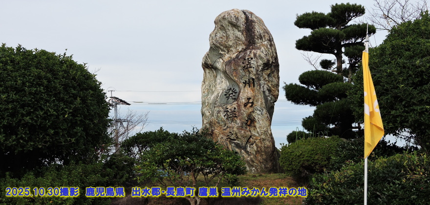 鹿児島県 出水郡・長島町 鷹巣 温州みかん発祥の地(うんしゅうみかんはっしょうのち)鹿児島県の北西部に位置する「長島」。天草諸島を構成する島の一つで、八代海と東シナ海に囲まれています。ブリやマダイ、アオサなどが豊富にとれる海の幸に恵まれた島で、古くは中国と交易を持つなど、独自の文化と歴史を育みました。島の北東の鷹巣地区には、「温州みかん発祥の地」の石碑が立っています。中国から天台宗の僧が持ち帰ったミカン類の樹木が島内で繁殖し、それらの樹の中から400~500年前に偶発的に「温州みかん」が誕生したと考えられています。