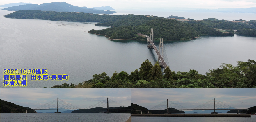 鹿児島県 出水郡・長島町 伊唐大橋 伊唐大橋(いからおおはし)は、鹿児島県出水郡長島町にある、長島と伊唐島を結ぶ全長675m、タワーの高さ85mの橋です。形式は、主橋梁部が5径間連続プレストレストコンクリート斜張橋、両側の取り付け部が単径間プレストレストコンクリート桁橋で、6年の歳月をかけて1,996年(平成8年)に完成しています。中央支間の260mは、開通時点ではコンクリート橋として日本最長でした。この橋も「長島五大橋(黒之瀬戸大橋、伊唐大橋、赤崎橋、竹島大橋、乳之瀬橋で構成されています)」の1つであり、島への生活道路として重要な役割を担っています。