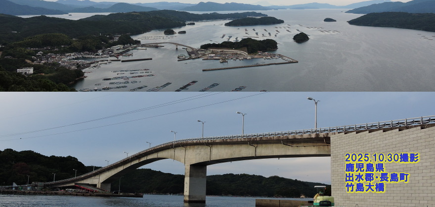 鹿児島県 出水郡・長島町 竹島大橋 竹島大橋(たけしまおおはし)は、鹿児島県出水郡長島町にある、長島本島と離島・竹島を結ぶ全長295mの橋です。1995年(平成7年)に開通し、周辺の自然と調和した美しい景色が楽しめるスポットです。この橋は「長島五大橋(黒之瀬戸大橋、伊唐大橋、赤崎橋、竹島大橋、乳之瀬橋で構成されています)」の1つであり、島への生活道路として重要な役割を担っています。