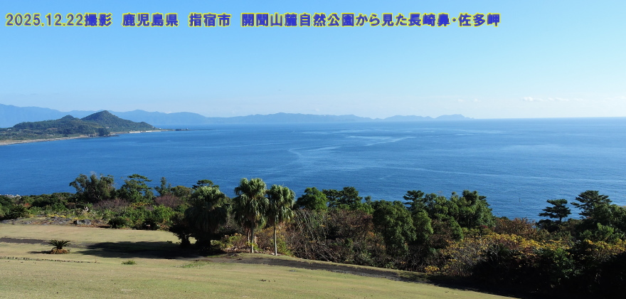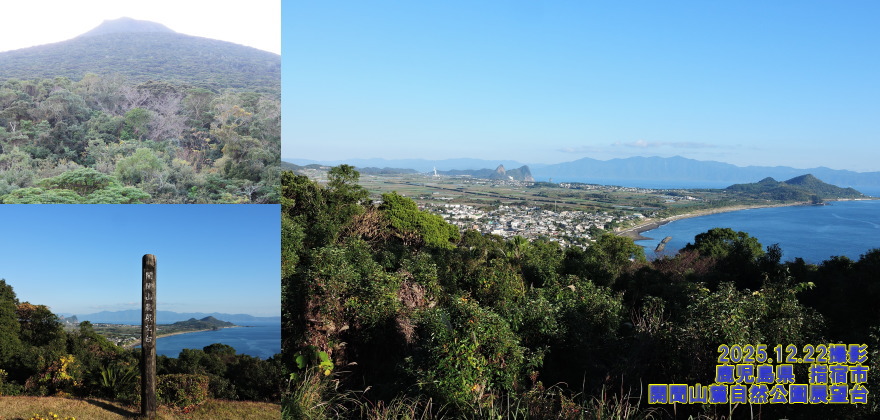 鹿児島県 指宿市 開聞山麓自然公園展望台 開聞岳の東麓に広がる開聞山麓自然公園(かいもんさんろくしぜんこうえん)は、825haの園内に約500種類、約10万本の熱帯・亜熱帯植物が茂る日本一のスケールを誇る亜熱帯植物園です。園内には日本在来種で県の天然記念物に指定されている「トカラ馬」が放し飼いにされ、触れることもできます。展望所からは東シナ海を望み、薩摩半島の長崎鼻等、半島南部の展望が開け、自然の様子を楽しむことができます。展望台の背後には開聞岳が聳え立っています(写真左上)。