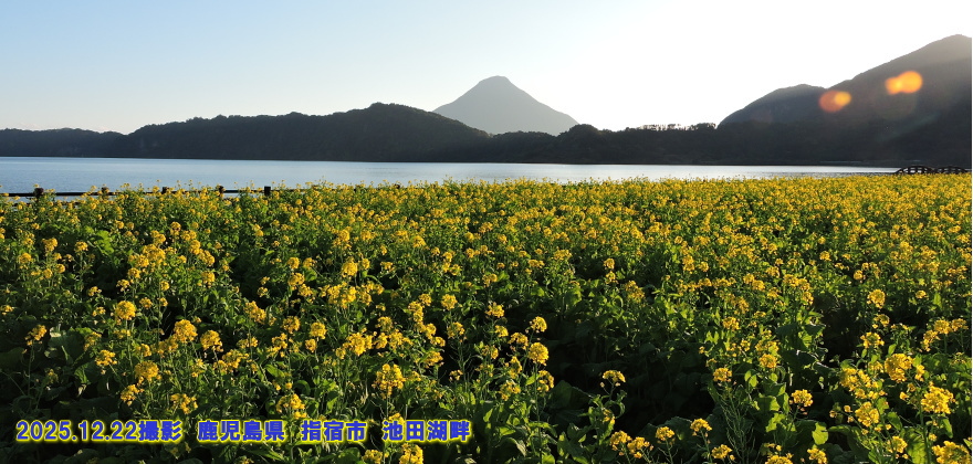 鹿児島県 指宿市 池田湖畔 池田湖(いけだこ)は大昔の火山活動によって形成された周囲15km、最大水深233mの九州最大のカルデラ湖です。誕生は約5700年前で、ただ1回の噴火で形成されたのではなく、周辺部も含めると6回の噴火で現在の形状になったそうです。指宿市の天然記念物に指定されている体長1.8m・胸回り60cm・体重20kgもの大うなぎが数多く生息し、また謎の生物「イッシー」が棲むといわれる神秘的な湖です。湖畔には四季折々の花々が植栽され、特に1月は菜の花が満開となり、「菜の花マラソン」をはじめジョギングやサイクリングのコースとしても多くの人が訪れ、その光景は一足早い春の訪れを感じさせてくれます。