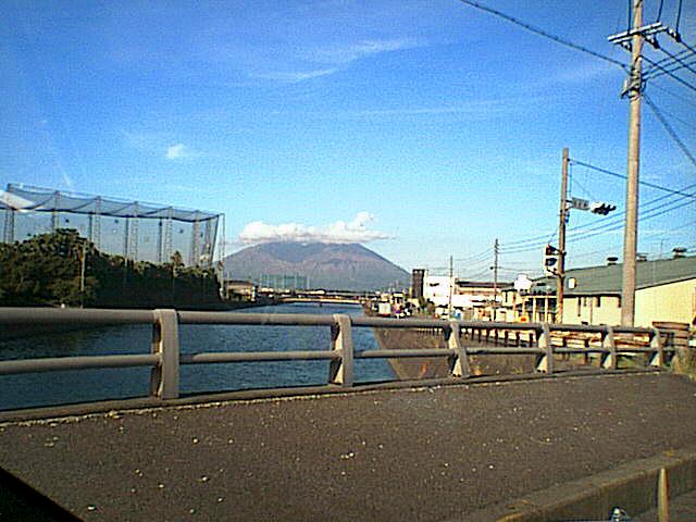 谷山中央付近からの桜島です。青い空と白い雲を背景にした七色の桜島が見えます。