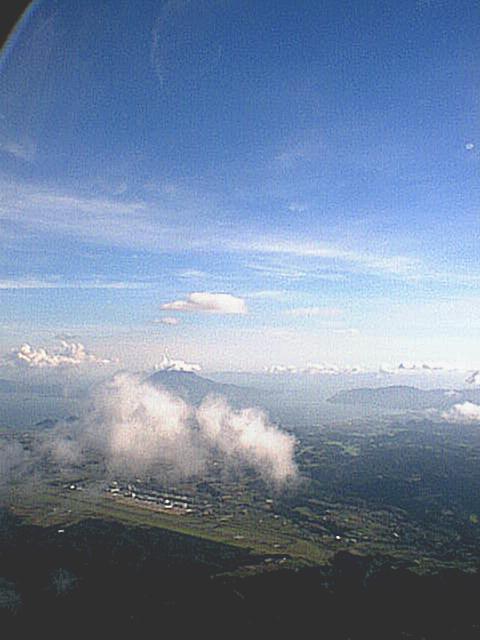 錦江湾に浮かぶ桜島を隼人上空から撮影しました。景色がはっきりしていないのは残念ですが、手前の雲が空から撮ったという感じを与えてくれます。