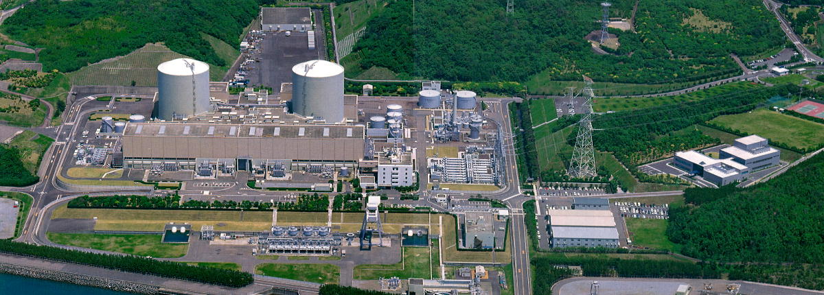 川内原子力発電所施設の外観。2基の原子炉がそびえ立っている。