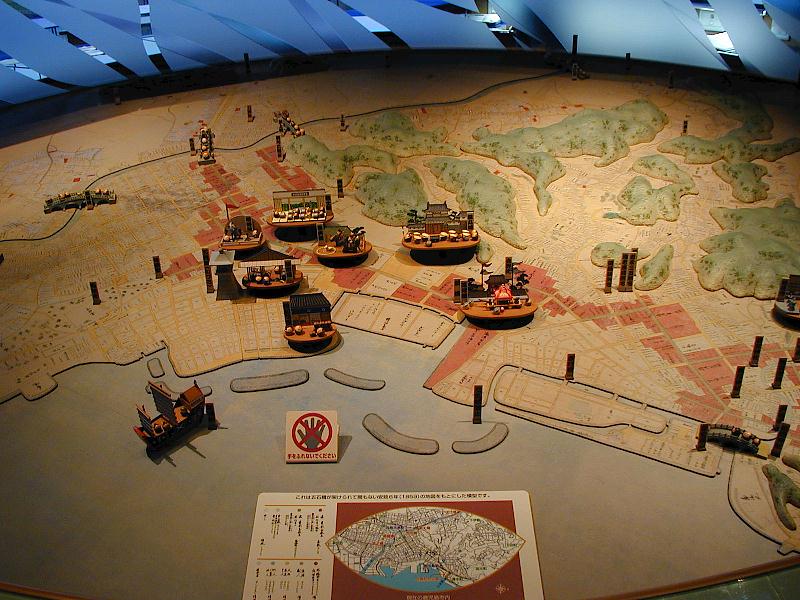 五石橋を構築した頃の鹿児島の城下の位置家計を示す。後方には、新上橋、西田橋、高麗橋が見えており、城下との位置関係がわかる。