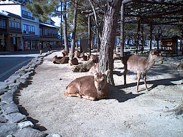 宮島の鹿達は、まだ朝が早かったせいかほとんどが膝をおり土の上でのんびりとしていた。