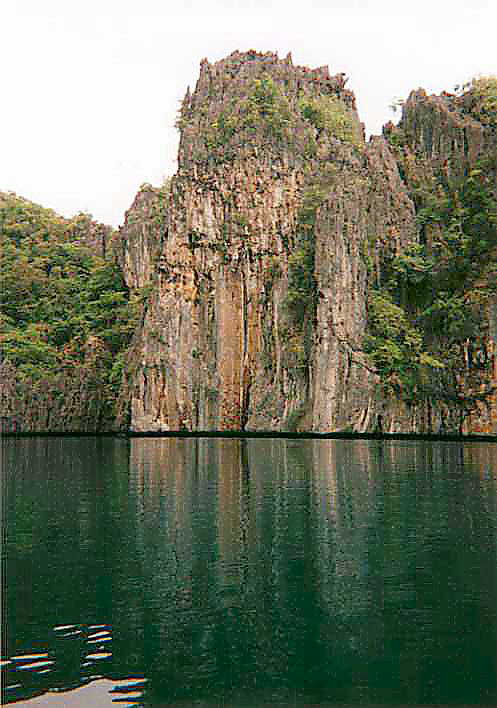 ラグーン内部はそびえ立つ岩峰が水面に写るほど波もなく静かであった。