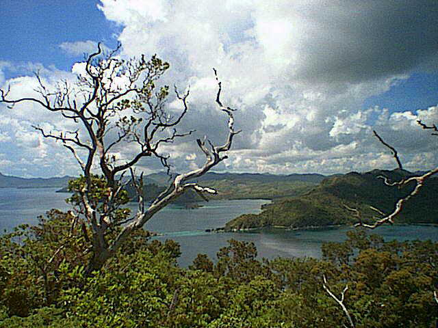 手前の白い木の右側に見える2つの砂州のうち、奥に見えるのがスネークアイランドである。