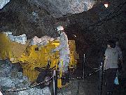 爆薬で堀り砕いた鉱石を積み込み運搬する機械です。鉱石は後方の箱の中に入れ、近くの立坑まで運びます。立坑では漏斗に流し込みます。