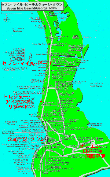 グランドケイマン島は、島の西側に街とリゾート地が広がっており、西側の海岸線沿いはリゾート地としてホテルエリアになっておりセブン・マイル・ビーチと呼ばれている。その南側に中心地であるジョージ・タウンがあり、政府関係の建物や免税店、港があり、その西側に空港がある。 島内は日曜日はほとんど休みとなるため、滞在する場合には注意が必要である。 |