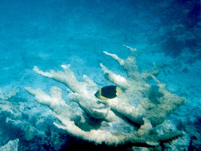 サンゴの前を遊泳するカラフルな魚。