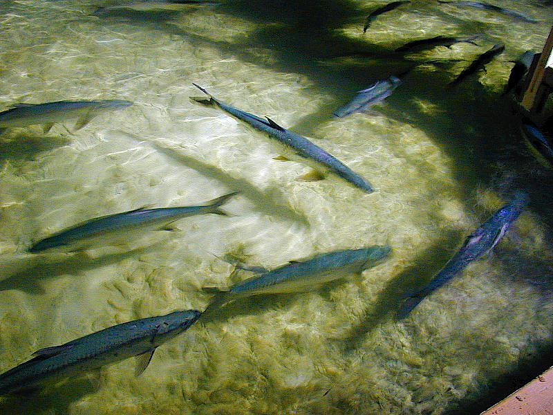 体長1m以上の巨大魚ターポンは餌づけされており、時間になると岸に近づいてきた。