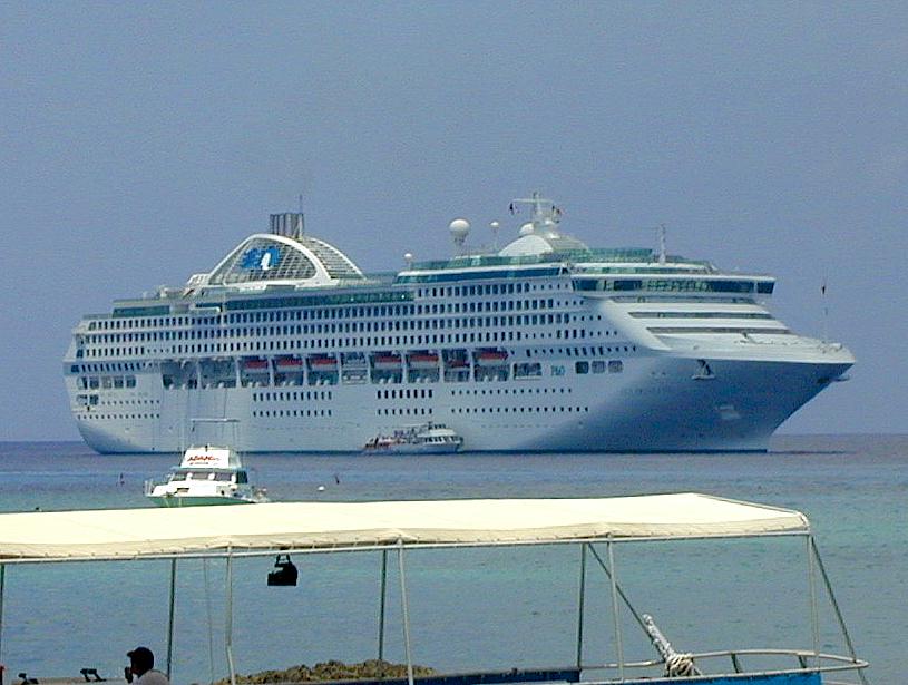 何階建ての豪華客船がでしょう、港へはタグボートを利用して行き来していました。