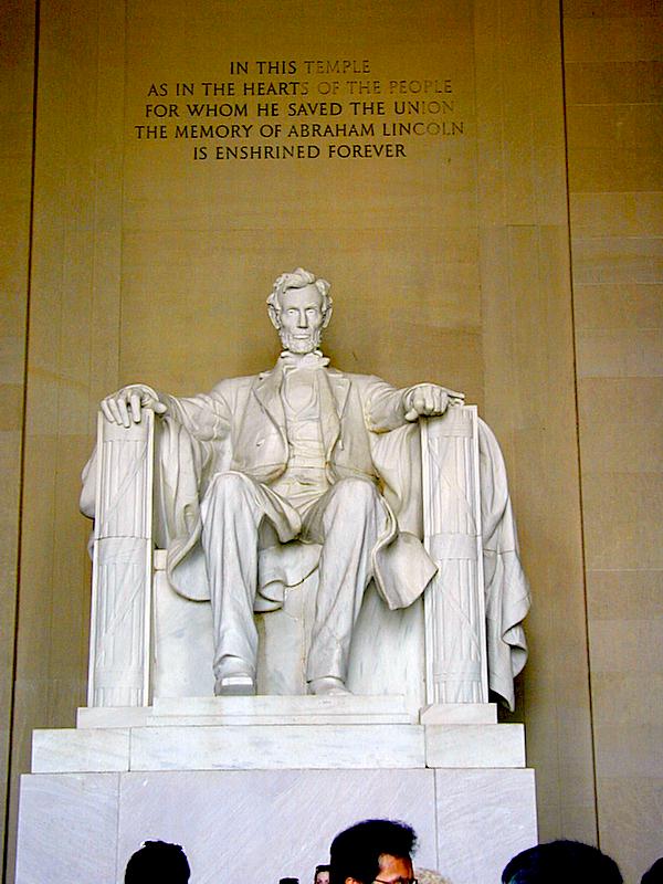 リンカーン記念像。ワシントン記念塔と国会議事堂を望む形で東方を向いて座っている。