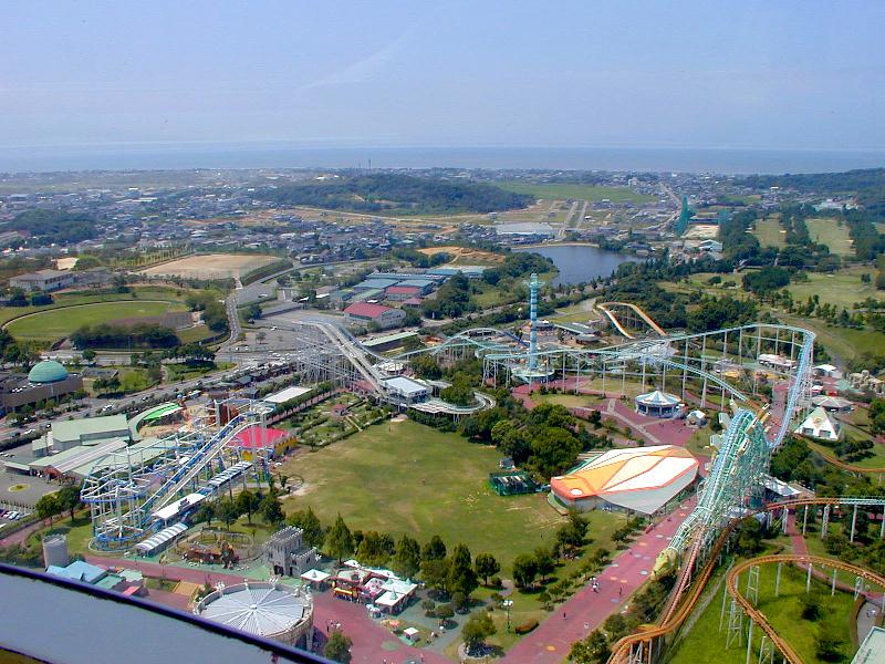 園内の光景。大小の沢山のジェットコースターの向こうには有明海を望むことができる。