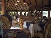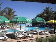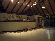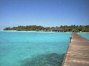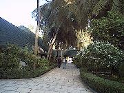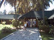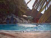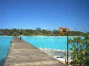 船着き場から島への橋を渡ると、エントランスがあり、南の国らしい雰囲気を感じさせる。 ちょっと先には、イルカの形をしたかわいいプール(噴水もイルカの口から出ている)もあり、のんびりすることができる。