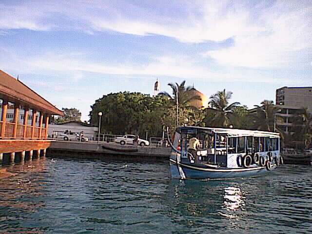 後方金色に輝いて見えるのが世界中のイスラム教徒の寄付によりできたモスクで、島に近づくとまず目にとまる建物である。手前に見える島々の往来に利用される小舟(ドーニ)との対比が印象的であった。尚、左端に見えるのは大統領用の桟橋とのことである。