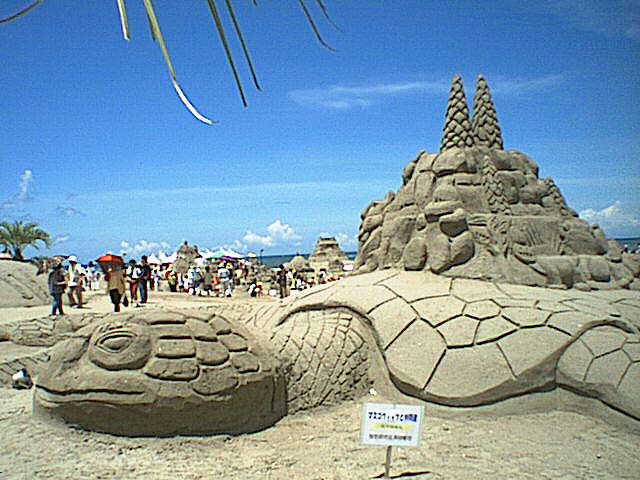 砂浜の砂像と青い海と青い空は気持ちをなごやかにしてくれます。